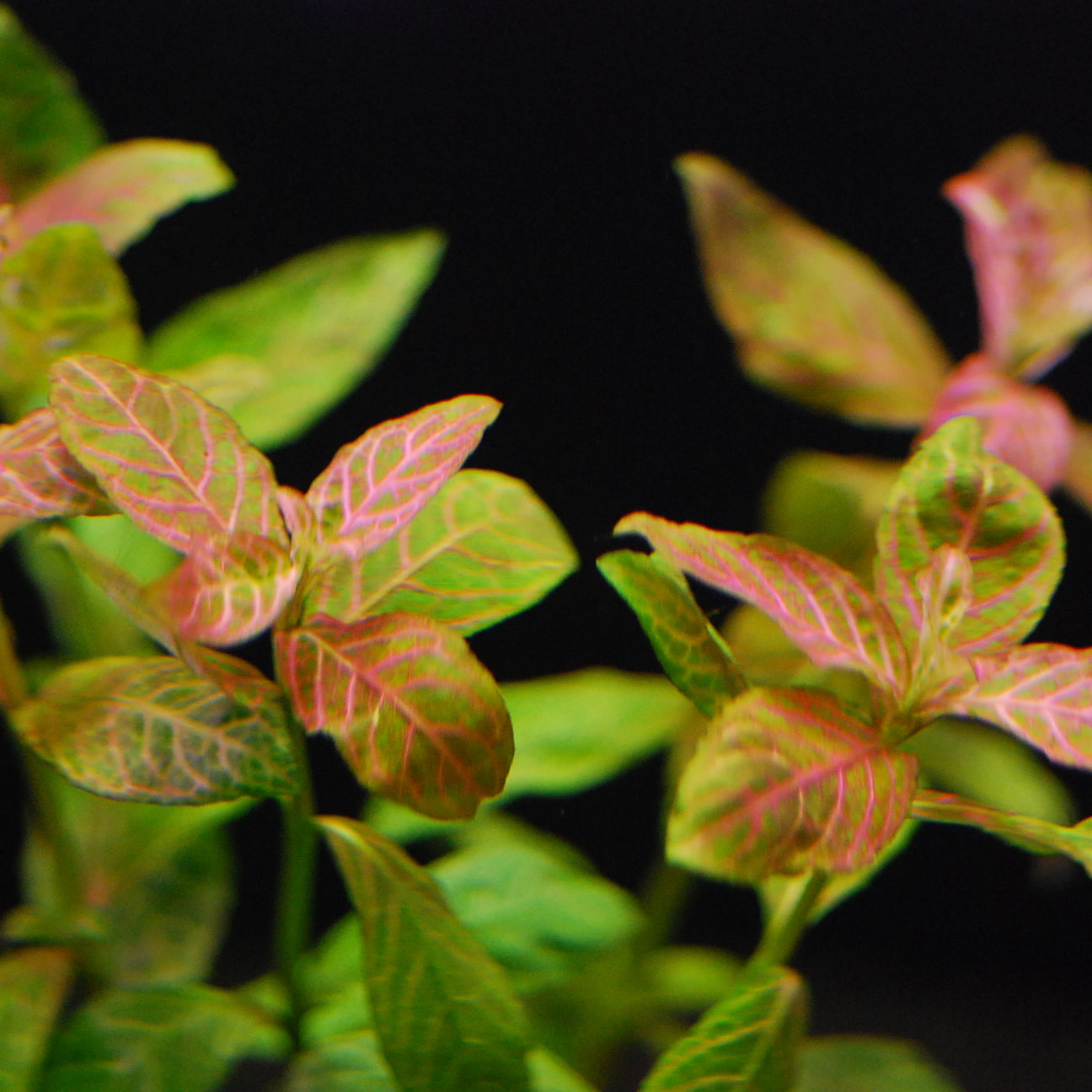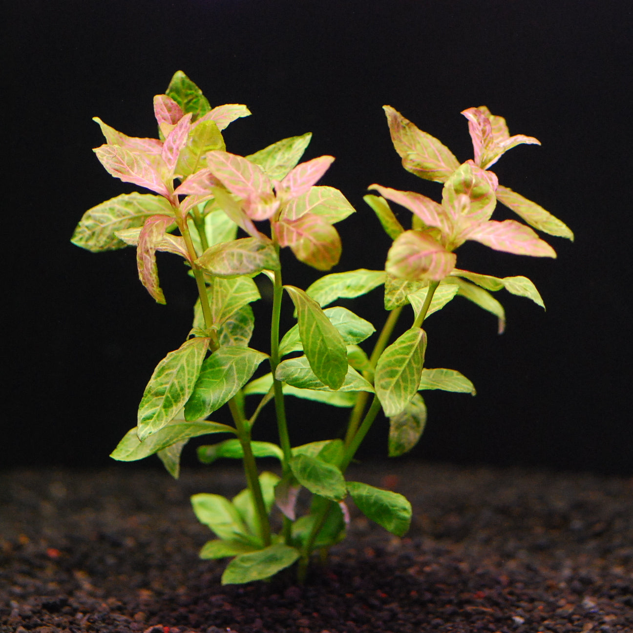 新葉に強く入るピンク色の斑が美しい。扱いやすい水草。