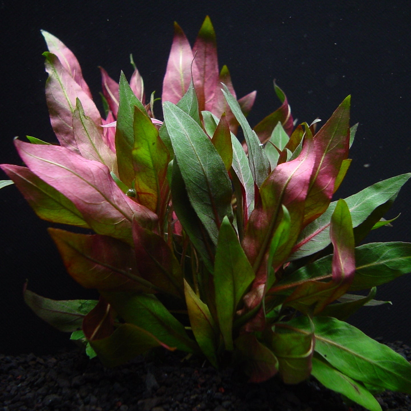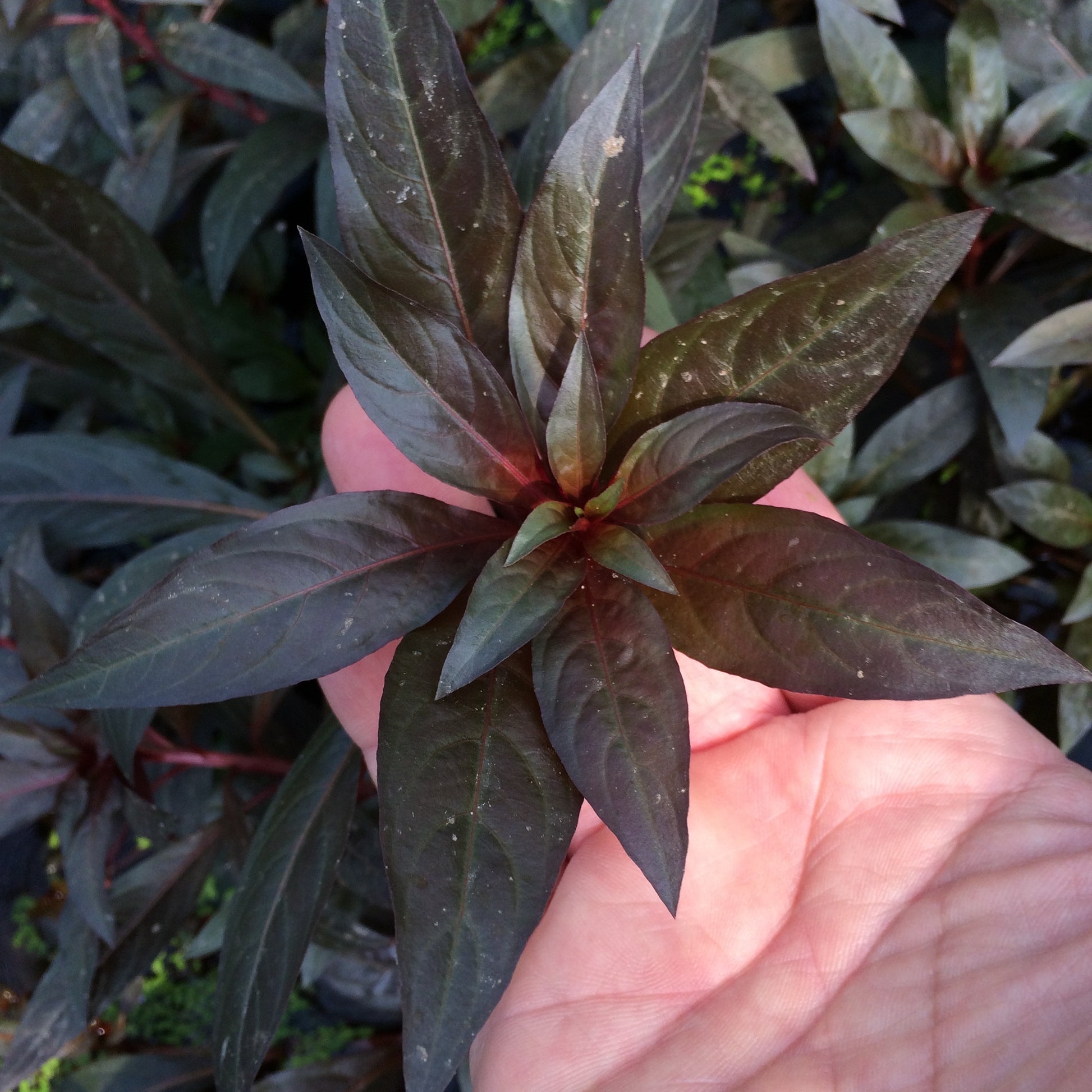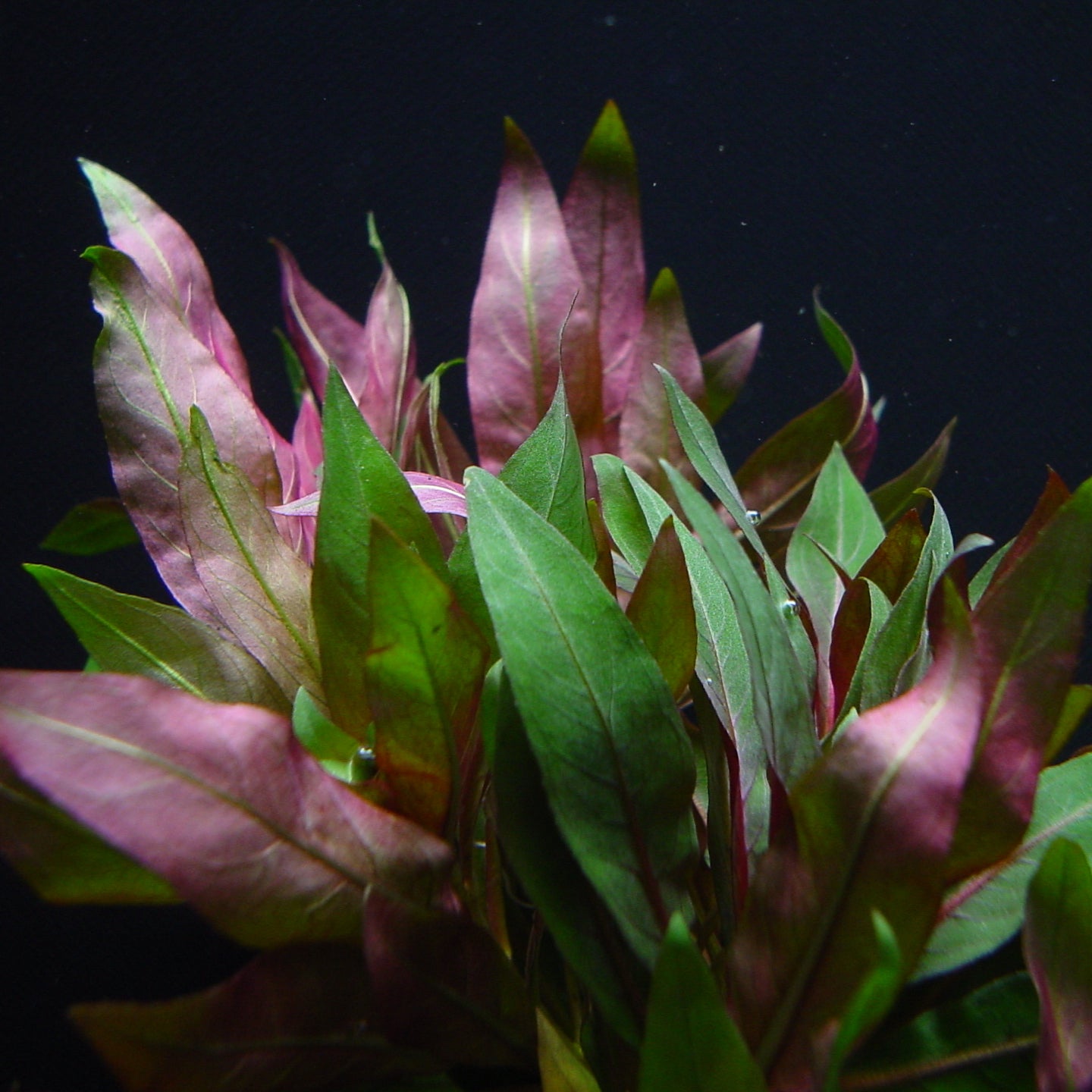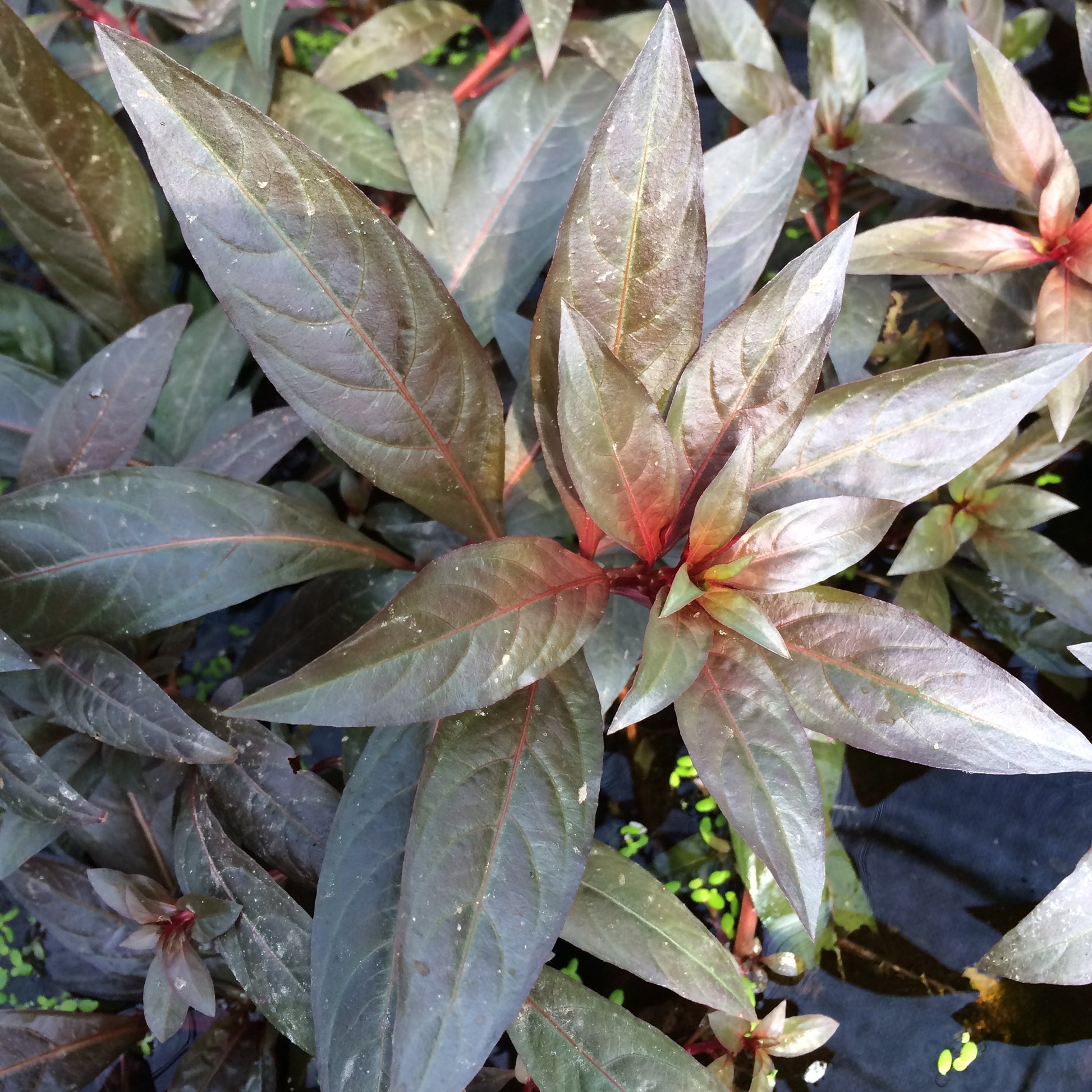 水上葉は環境により、色や形が少し変化する。水中葉は濃い赤色で成長が遅いので前?中景の緑の中のアクセントに使える。