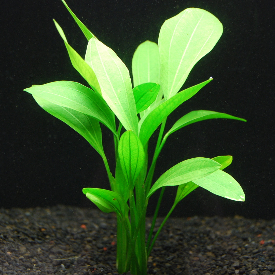 またの名をスプーンソードプラント。スプーン状の葉を付け、非常に大型になる種類。水中でも育成は可能だが、水上でアクアテラリュームに使用しても面白い。写真は1本をまとめて植えたときの状態です。