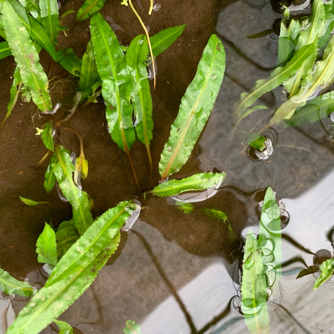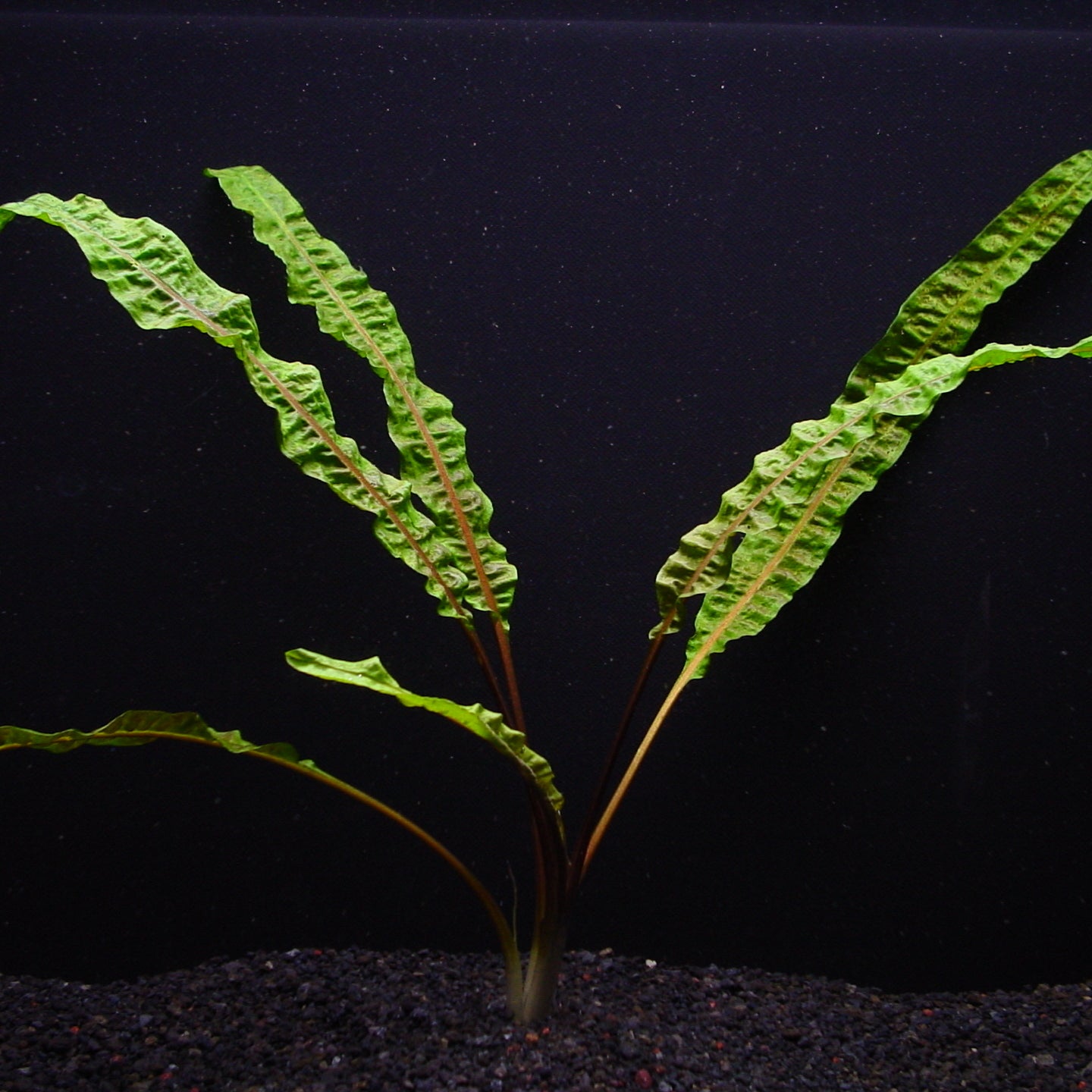 細葉で葉の表面が凹凸になるクリプトコリネ。葉長は30cm以上になる。葉の色は濃い緑色、環境によっては赤みがかかる。