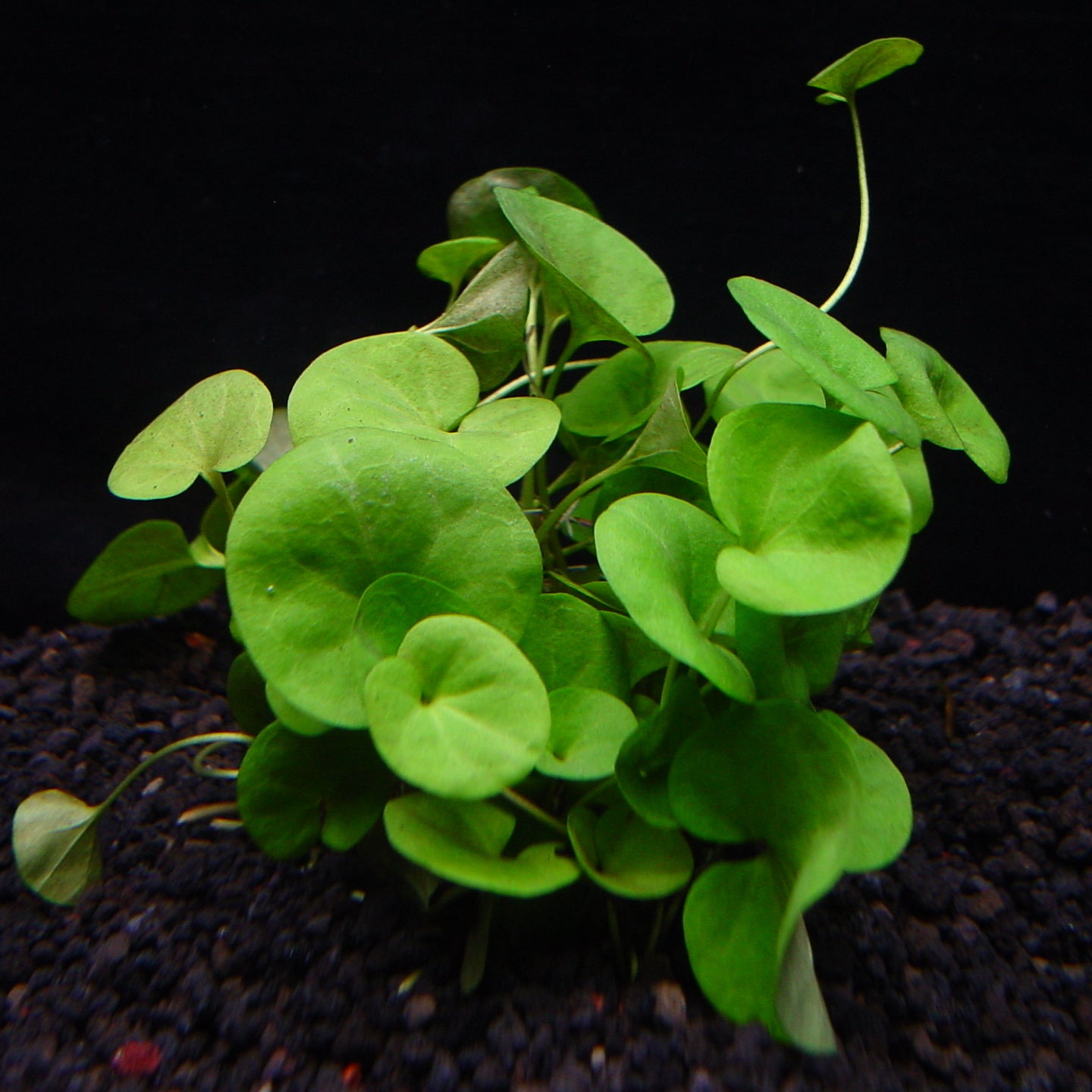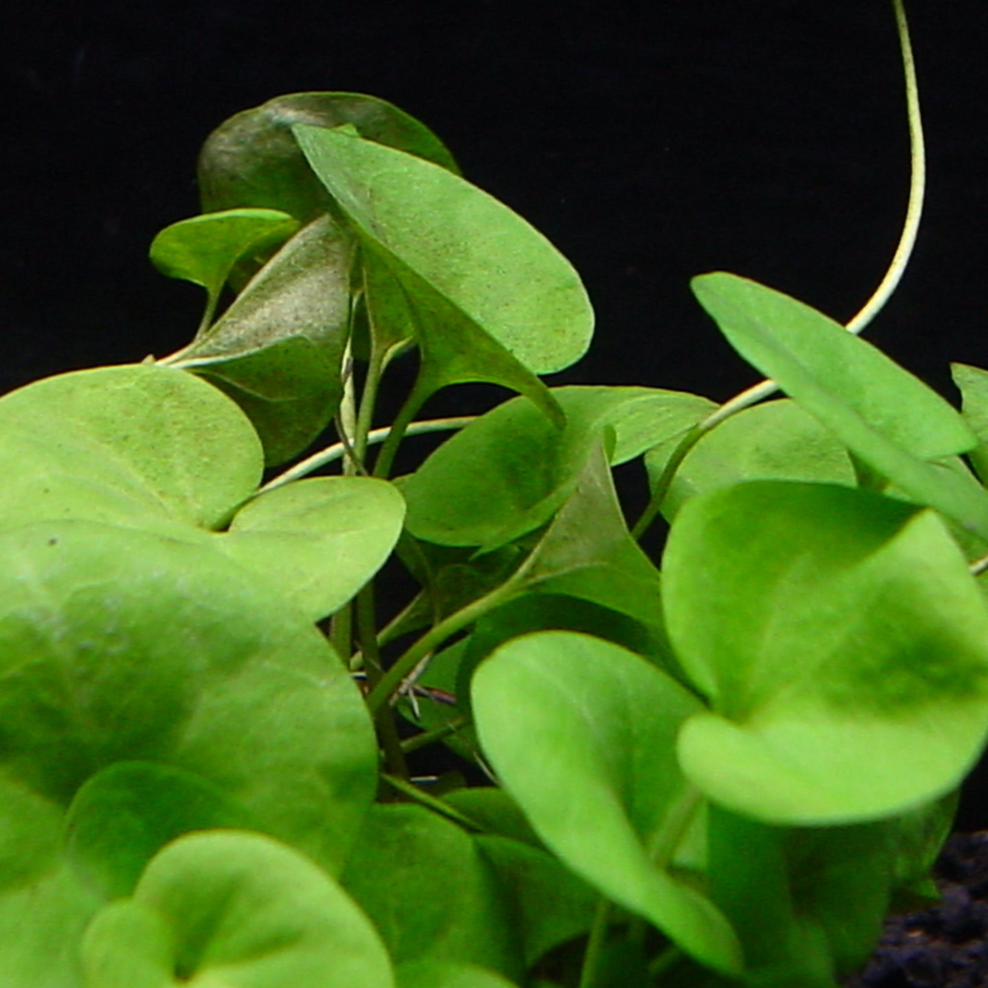 匍匐するつる性の草。水中ではなくアクアテラリウム向きの湿地性の植物。円形の可愛らしい葉を付ける。